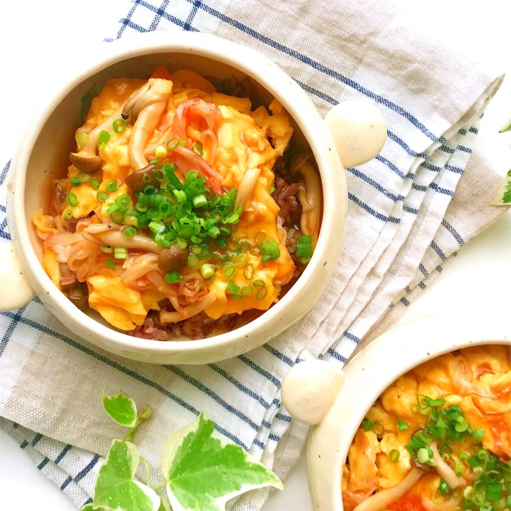 - フライパンにごま油大さじ1/2を入れ小房に分けたしめじとかにかまぼこを入れ炒める。しめじがしんなりしてきたら②の卵液を入れ混ぜながらふんわり焼き、①のご飯の上にのせる。