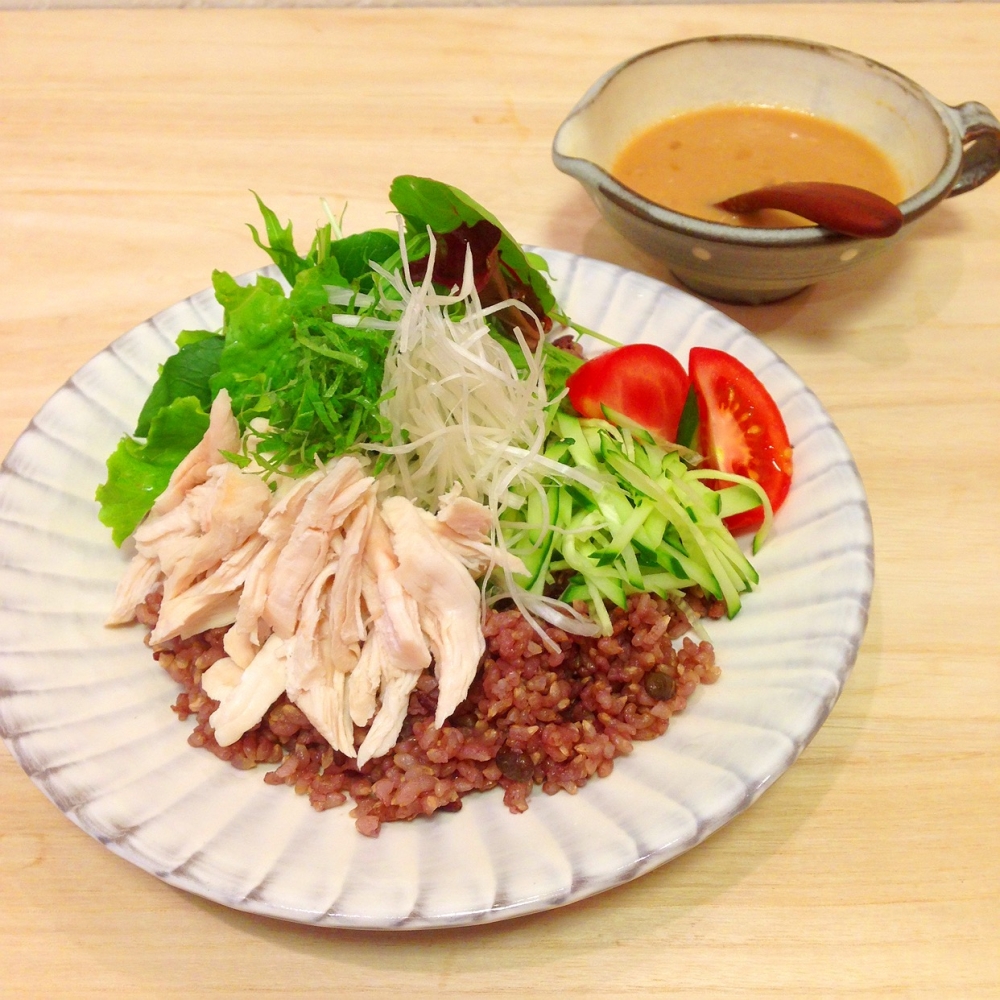 - 器に冷やした美人玄米ごはん、②の鶏肉、③の野菜を盛り付け、ごまだれをかけていただく。